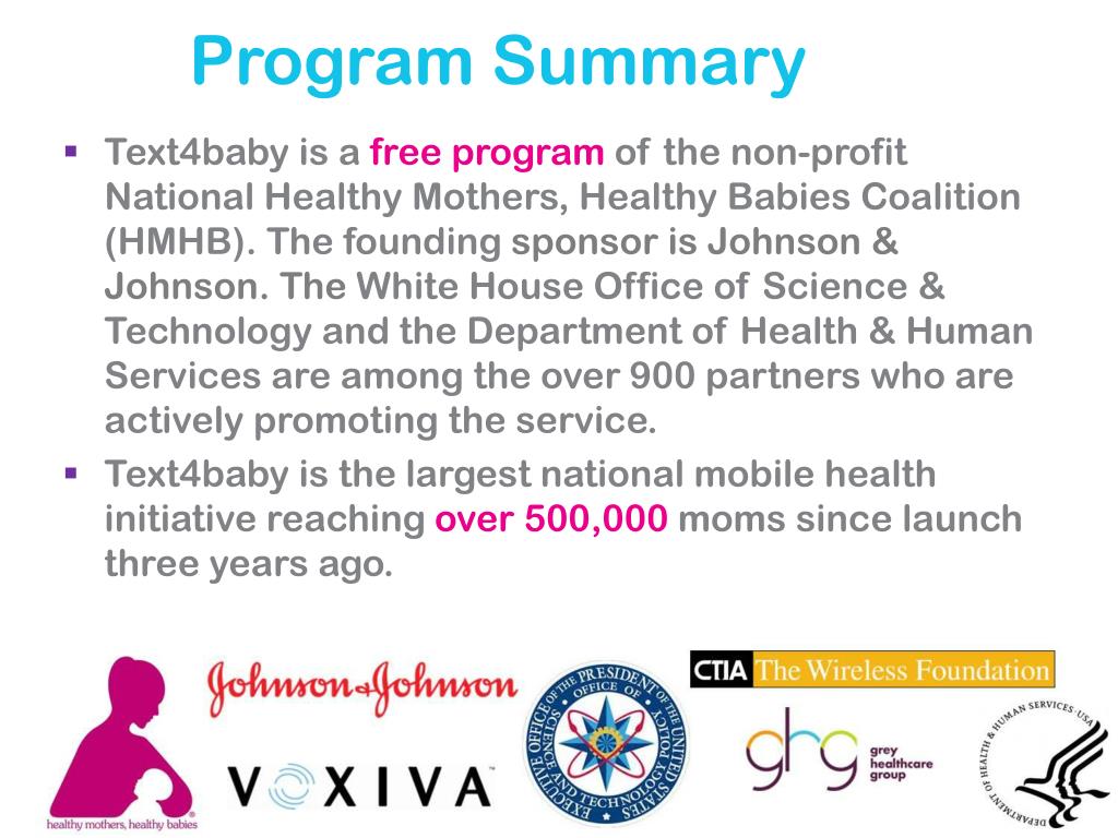 Program Summary • Text4baby is a free program of the non-profit National Healthy Mothers, Healthy Babies Coalition (HMHB). The founding sponsor is Johnson & Johnson.The White House Office of Science & Technology and the Department of Health & Human Services are among the over 900 partners who are actively promoting the service. • Text4baby is the largest national mobile health initiative reaching over 500,000 moms since launch three years ago.
