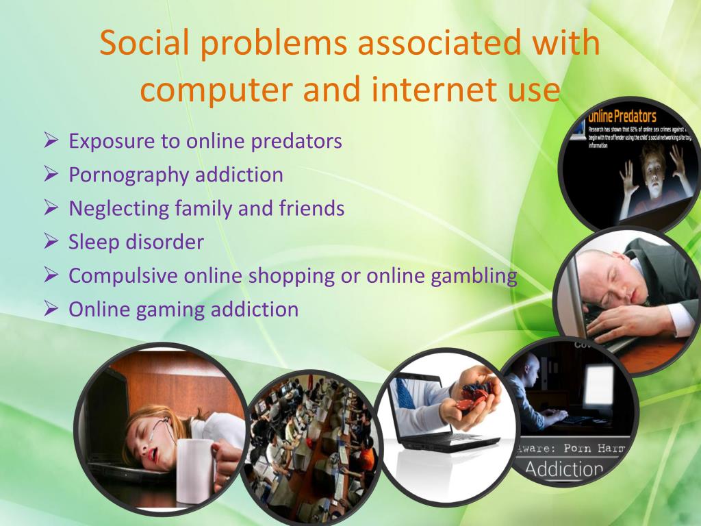 Social problems associated with computer and internet use • Exposure to online predators • Pornography addiction • Neglecting family and friends • Sleep disorder • Compulsive online shopping or online gambling • Online gaming addiction