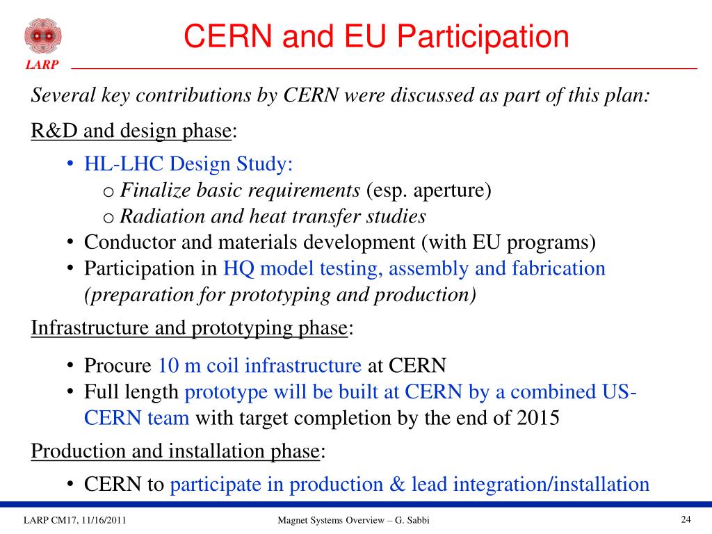 CERN and EU Participation • Several key contributions by CERN were discussed as part of this plan: • R&D and design phase: • HL-LHC Design Study: • Finalize basic requirements (esp. aperture) • Radiation and heat transfer studies • Conductor and materials development (with EU programs) • Participation in HQ model testing, assembly and fabrication (preparation for prototyping and production) • Infrastructure and prototyping phase: • Procure 10 m coil infrastructure at CERN • Full length prototype will be built at CERN by a combined US-CERN team with target completion by the end of 2015 • Production and installation phase: • CERN to participate in production & lead integration/installation