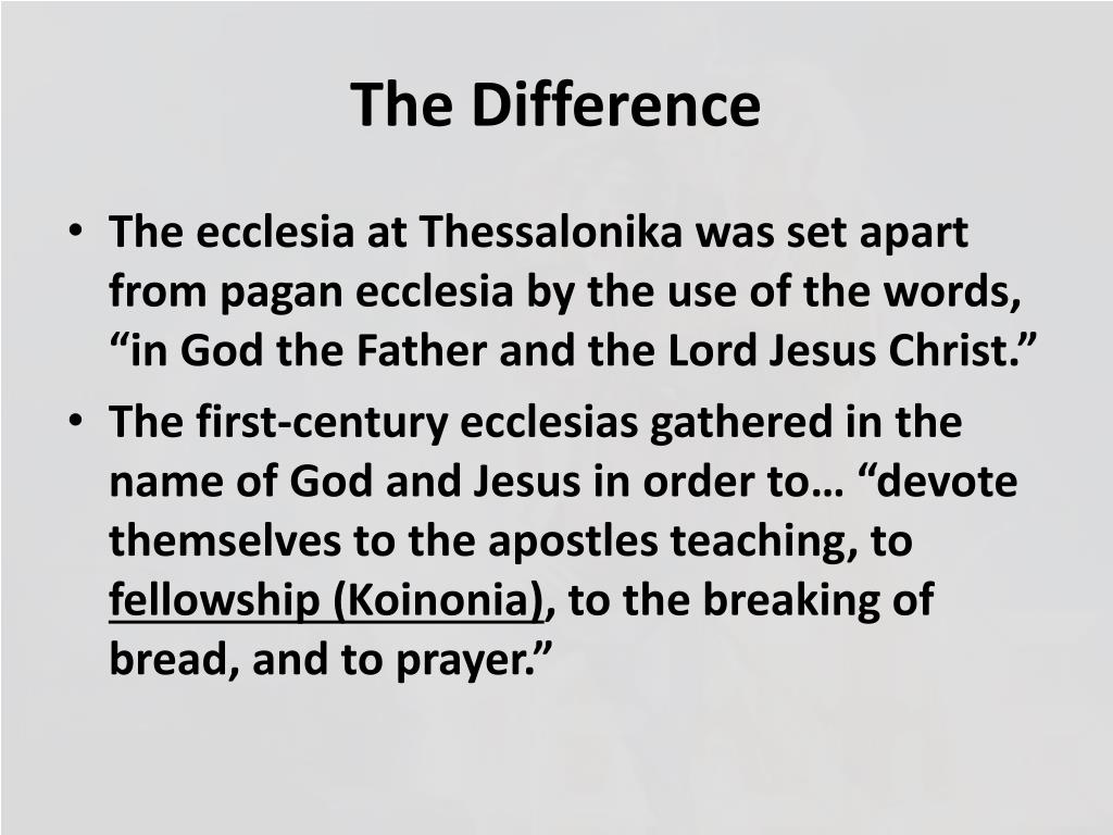 The Difference • The ecclesia at Thessalonika was set apart from pagan ecclesia by the use of the words, “in God the Father and the Lord Jesus Christ.” • The first-century ecclesias gathered in the name of God and Jesus in order to… “devote themselves to the apostles teaching, to fellowship (Koinonia), to the breaking of bread, and to prayer.”