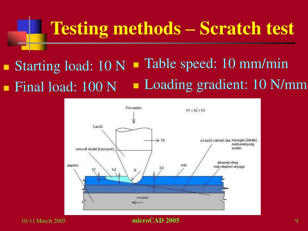 Testing methods – Scratch test • Table speed: 10 mm/min • Loading gradient: 10 N/mm • Starting load: 10 N • Final load: 100 N microCAD 2005