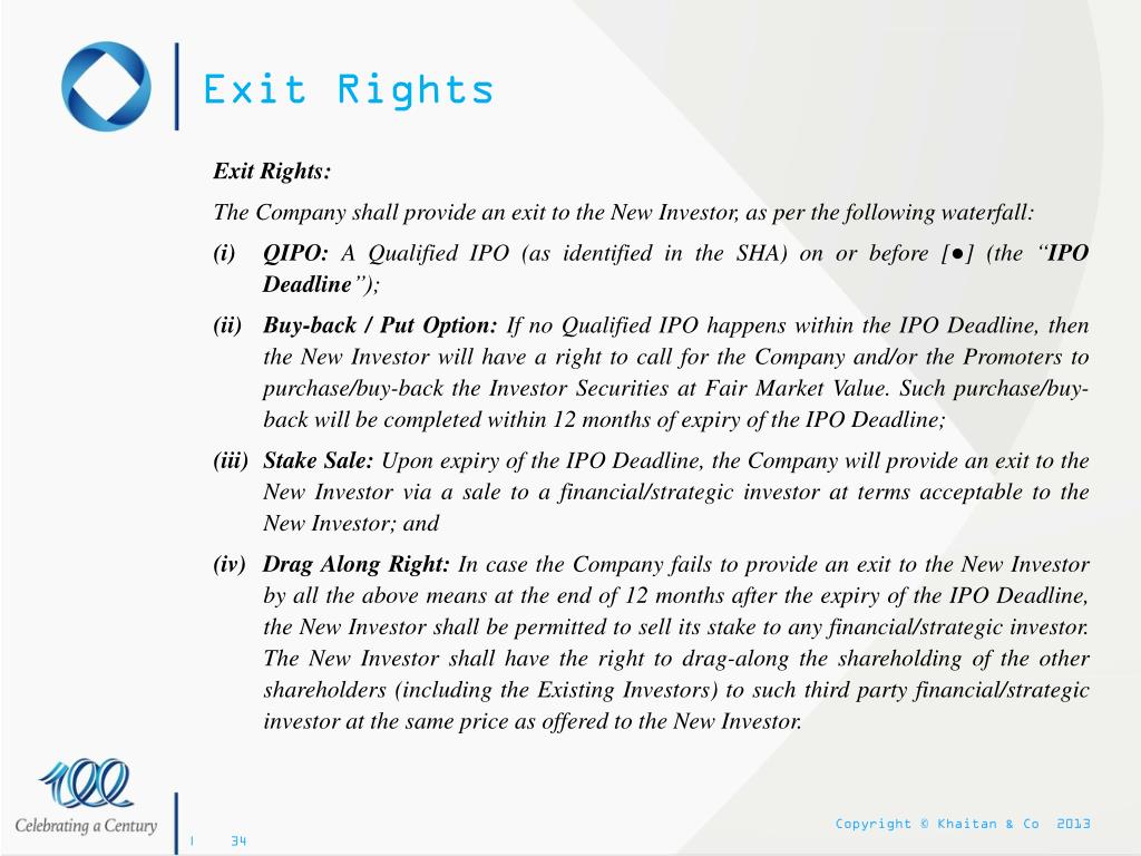 Exit Rights • Exit Rights: • The Company shall provide an exit to the New Investor, as per the following waterfall: • QIPO: A Qualified IPO (as identified in the SHA) on or before [●] (the “IPO Deadline”); • Buy-back / Put Option: If no Qualified IPO happens within the IPO Deadline, then the New Investor will have a right to call for the Company and/or the Promoters to purchase/buy-back the Investor Securities at Fair Market Value. Such purchase/buy-back will be completed within 12 months of expiry of the IPO Deadline; • Stake Sale: Upon expiry of the IPO Deadline, the Company will provide an exit to the New Investor via a sale to a financial/strategic investor at terms acceptable to the New Investor; and • Drag Along Right: In case the Company fails to provide an exit to the New Investor by all the above means at the end of 12 months after the expiry of the IPO Deadline, the New Investor shall be permitted to sell its stake to any financial/strategic investor. The New Investor shall have the right to drag-along the shareholding of the other shareholders (including the Existing Investors) to such third party financial/strategic investor at the same price as offered to the New Investor.