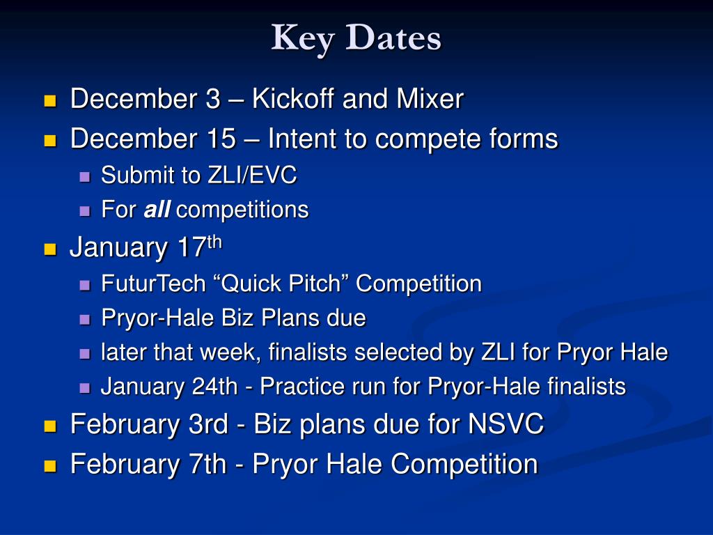 Key Dates • December 3 – Kickoff and Mixer • December 15 – Intent to compete forms • Submit to ZLI/EVC • For all competitions • January 17th • FuturTech “Quick Pitch” Competition • Pryor-Hale Biz Plans due • later that week, finalists selected by ZLI for Pryor Hale • January 24th - Practice run for Pryor-Hale finalists • February 3rd - Biz plans due for NSVC • February 7th - Pryor Hale Competition
