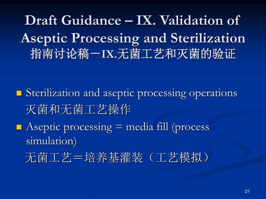 Draft Guidance – IX. Validation of Aseptic Processing and Sterilization指南讨论稿-IX.无菌工艺和灭菌的验证 • Sterilization and aseptic processing operations 灭菌和无菌工艺操作 • Aseptic processing = media fill (process simulation) 无菌工艺=培养基灌装(工艺模拟)
