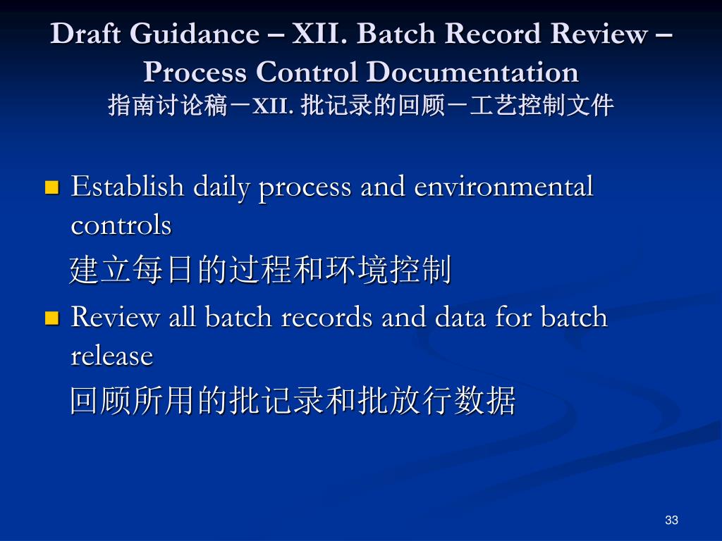 Draft Guidance – XII. Batch Record Review – Process Control Documentation指南讨论稿-XII. 批记录的回顾-工艺控制文件 • Establish daily process and environmental controls 建立每日的过程和环境控制 • Review all batch records and data for batch release 回顾所用的批记录和批放行数据