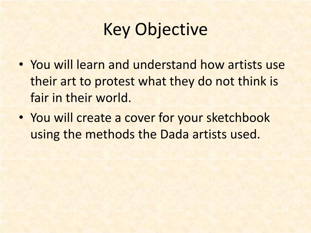 Key Objective • You will learn and understand how artists use their art to protest what they do not think is fair in their world. • You will create a cover for your sketchbook using the methods the Dada artists used.