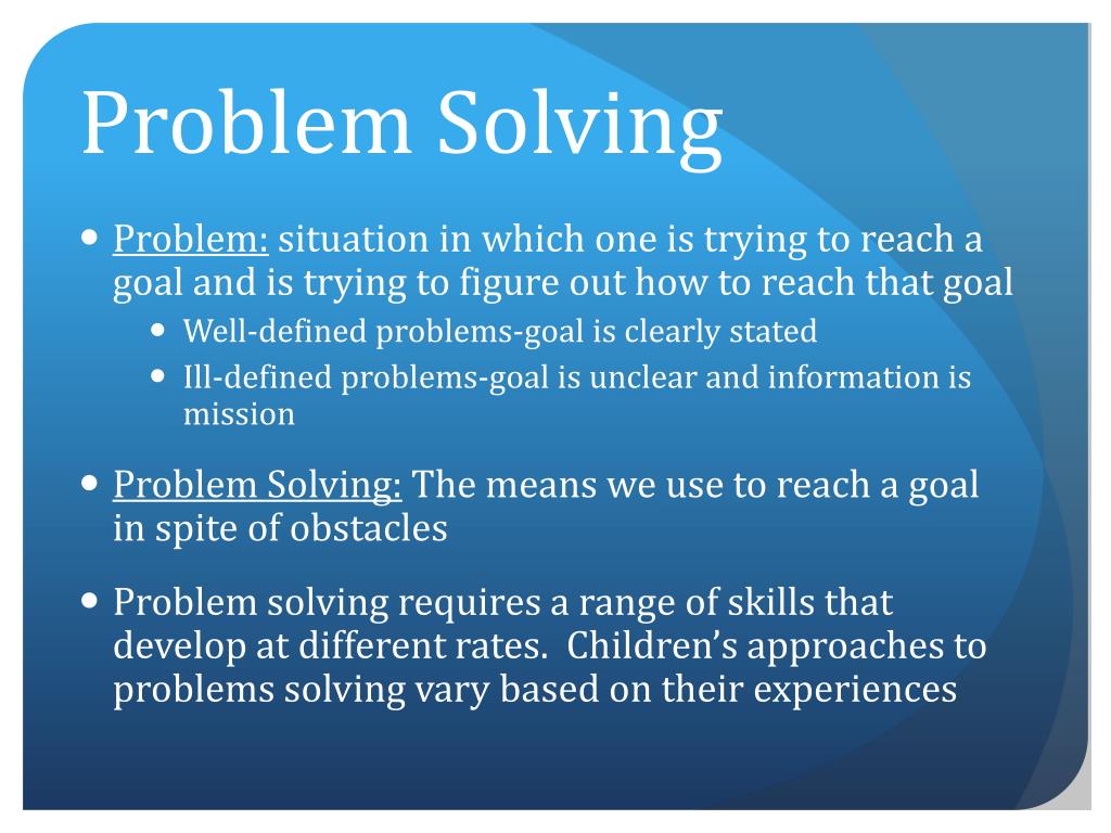 Problem Solving • Problem: situation in which one is trying to reach a goal and is trying to figure out how to reach that goal • Well-defined problems-goal is clearly stated • Ill-defined problems-goal is unclear and information is mission • Problem Solving: The means we use to reach a goal in spite of obstacles • Problem solving requires a range of skills that develop at different rates. Children’s approaches to problems solving vary based on their experiences