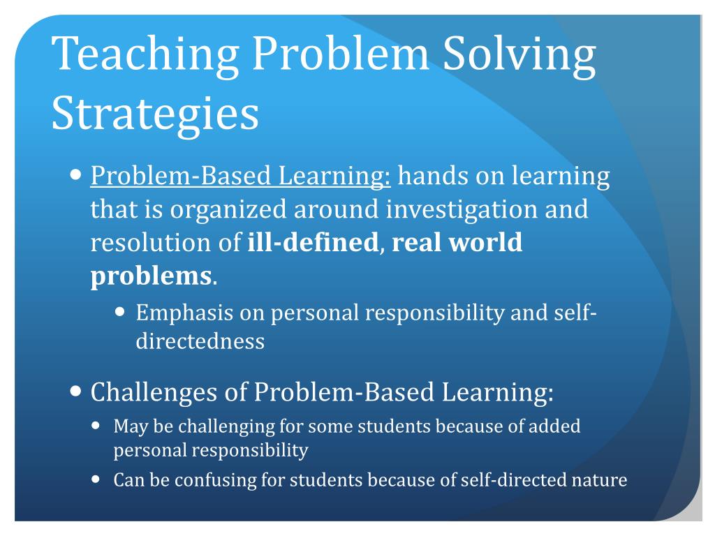 Teaching Problem Solving Strategies • Problem-Based Learning: hands on learning that is organized around investigation and resolution of ill-defined, real world problems. • Emphasis on personal responsibility and self-directedness • Challenges of Problem-Based Learning: • May be challenging for some students because of added personal responsibility • Can be confusing for students because of self-directed nature