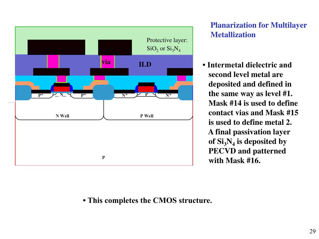 Planarization for Multilayer Metallization Protective layer: SiO2 or Si3N4 via • Intermetal dielectric and second level metal are deposited and defined in the same way as level #1. Mask #14 is used to define contact vias and Mask #15 is used to define metal 2. A final passivation layer of Si3N4 is deposited by PECVD and patterned with Mask #16. ILD • This completes the CMOS structure.