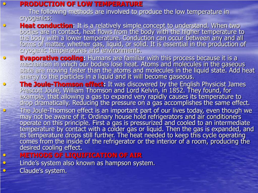 PRODUCTION OF LOW TEMPERATURE The following methods are involved to produce the low temperature in cryogenics: • Heat conduction: It is a relatively simple concept to understand. When two bodies are in contact, heat flows from the body with the higher temperature to the body with a lower temperature. Conduction can occur between any and all forms of matter, whether gas, liquid, or solid. It is essential in the production of cryogenic temperatures and environments. • Evaporative cooling: Humans are familiar with this process because it is a mechanism in which our bodies lose heat. Atoms and molecules in the gaseous state are moving faster than the atoms and molecules in the liquid state. Add heat energy to the particles in a liquid and it will become gaseous. • The Joule-Thomson effect: It was discovered by the English Physicist James Prescott Joule, William Thomson and Lord Kelvin, in 1852. They found, for example, that allowing a gas to expand very rapidly causes its temperature to drop dramatically. Reducing the pressure on a gas accomplishes the same effect. • The Joule-Thomson effect is an important part of our lives today, even though we may not be aware of it. Ordinary house hold refrigerators and air conditioners operate on this principle. First a gas is pressurized and cooled to an intermediate temperature by contact with a colder gas or liquid. Then the gas is expanded, and its temperature drops still further. The heat needed to keep this cycle operating comes from the inside of the refrigerator or the interior of a room, producing the desired cooling effect. • METHODS OF LIQUIFICATION OF AIR • Linde’s system also known as hampson system. • Claude’s system.