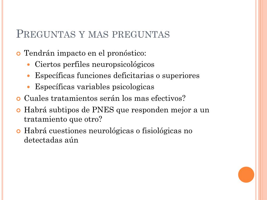 Preguntas y mas preguntas • Tendránimpacto en el pronóstico: • Ciertosperfilesneuropsicológicos • Específicasfuncionesdeficitarias o superiores • Específicas variables psicologicas • Cualestratamientosserán los mas efectivos? • Habrásubtipos de PNES querespondenmejor a un tratamientoqueotro? • Habrácuestionesneurológicas o fisiológicas no detectadasaún