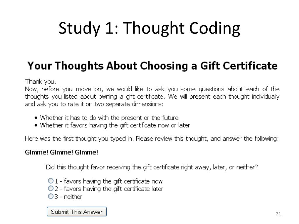 Study 1: Thought Measure • Prominence of Now Thoughts (Cronbach’sα = 0.91) • Order of thoughts (SMRD) • Proportion of now thoughts • Proportion of later thoughts (reverse scored) Increasing number indicates more and earlier thoughts in favor of now