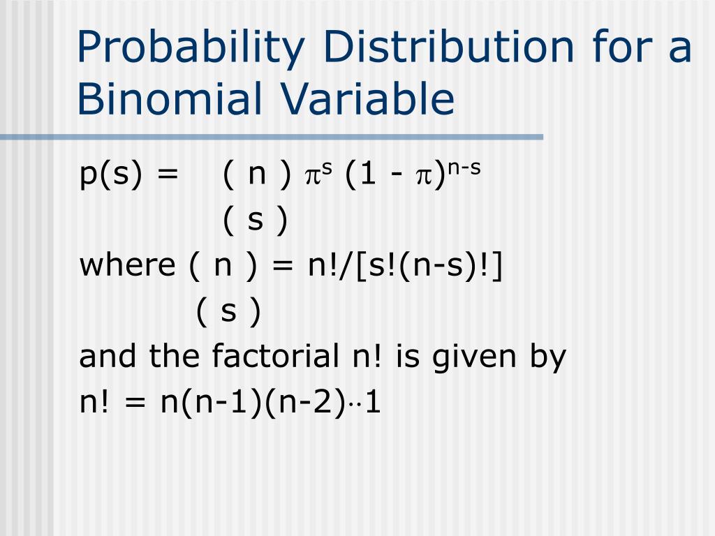 Probability Distribution for a Binomial Variable p(s) = ( n ) s (1 - )n-s ( s ) where ( n ) = n!/[s!(n-s)!] ( s ) and the factorial n! is given by n! = n(n-1)(n-2)1