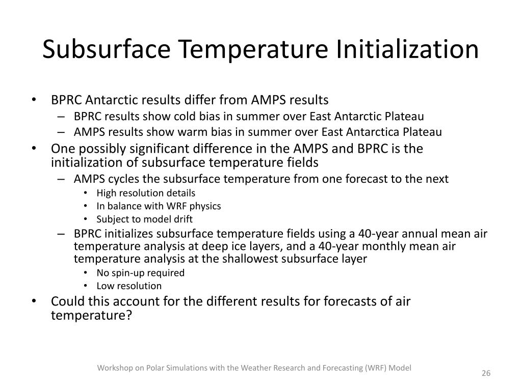 Subsurface Temperature Initialization • BPRC Antarctic results differ from AMPS results • BPRC results show cold bias in summer over East Antarctic Plateau • AMPS results show warm bias in summer over East Antarctica Plateau • One possibly significant difference in the AMPS and BPRC is the initialization of subsurface temperature fields • AMPS cycles the subsurface temperature from one forecast to the next • High resolution details • In balance with WRF physics • Subject to model drift • BPRC initializes subsurface temperature fields using a 40-year annual mean air temperature analysis at deep ice layers, and a 40-year monthly mean air temperature analysis at the shallowest subsurface layer • No spin-up required • Low resolution • Could this account for the different results for forecasts of air temperature? Workshop on Polar Simulations with the Weather Research and Forecasting (WRF) Model