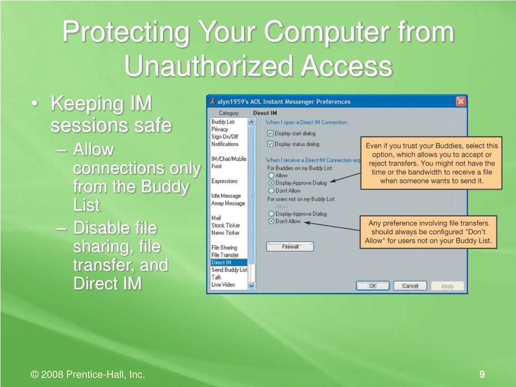 Protecting Your Computer from Unauthorized Access • Keeping IM sessions safe • Allow connections only from the Buddy List • Disable file sharing, file transfer, and Direct IM