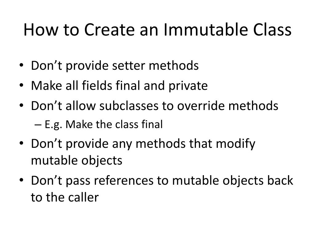 How to Create an Immutable Class • Don’t provide setter methods • Make all fields final and private • Don’t allow subclasses to override methods • E.g. Make the class final • Don’t provide any methods that modify mutable objects • Don’t pass references to mutable objects back to the caller