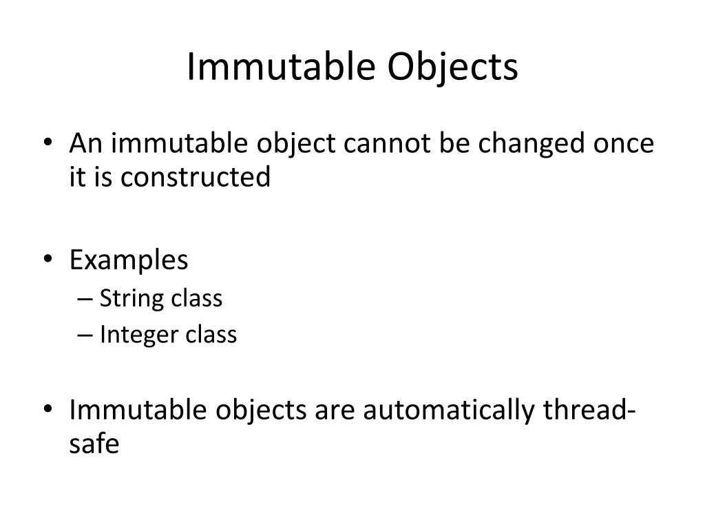 Immutable Objects • An immutable object cannot be changed once it is constructed • Examples • String class • Integer class • Immutable objects are automatically thread-safe