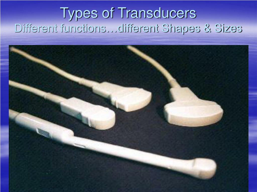 Ultrasound Transducer • An Ultrasound Transducer will both transmit and receive high-frequency sounds above the threshold of human hearing. • Works in a manner similar to SONAR. SO(UND) + NA(VIGATION) + A(ND) + R(ANGING)