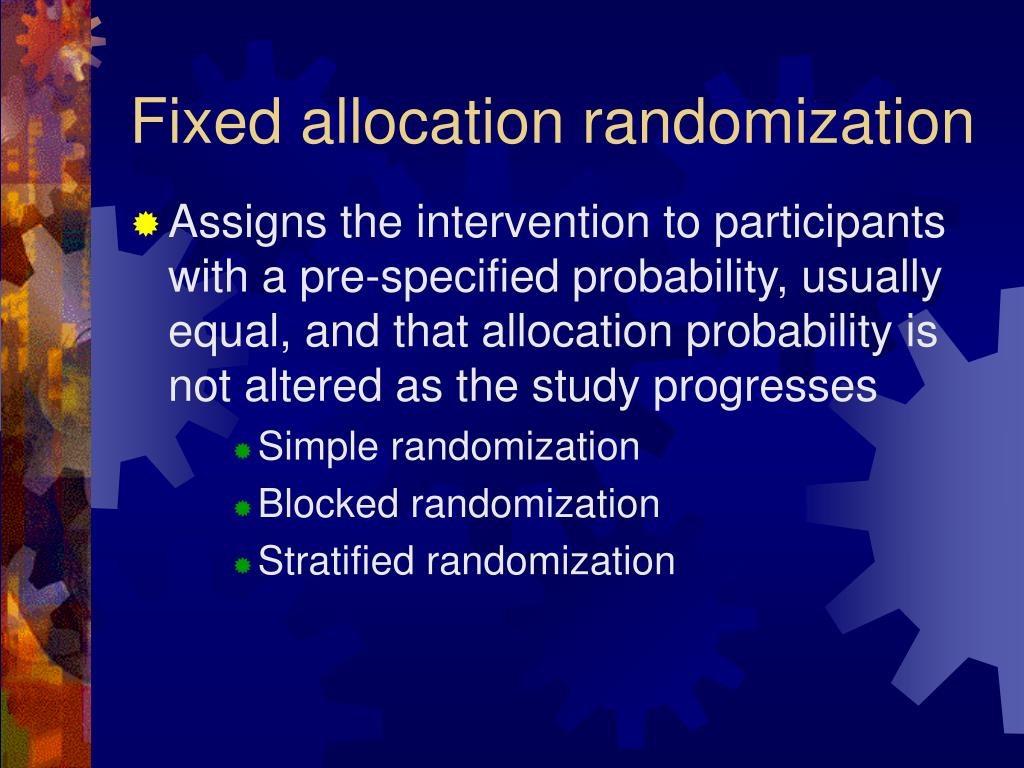 Fixed allocation randomization • Assigns the intervention to participants with a pre-specified probability, usually equal, and that allocation probability is not altered as the study progresses • Simple randomization • Blocked randomization • Stratified randomization