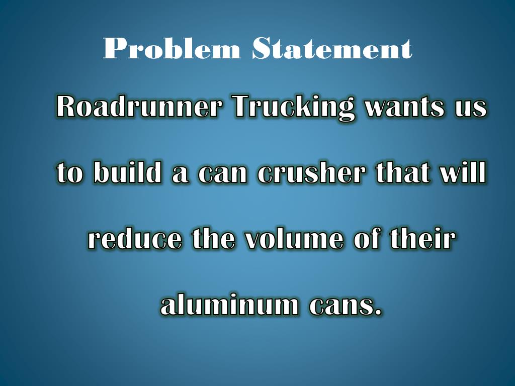 Problem Statement Roadrunner Trucking wants us to build a can crusher that will reduce the volume of their aluminum cans.