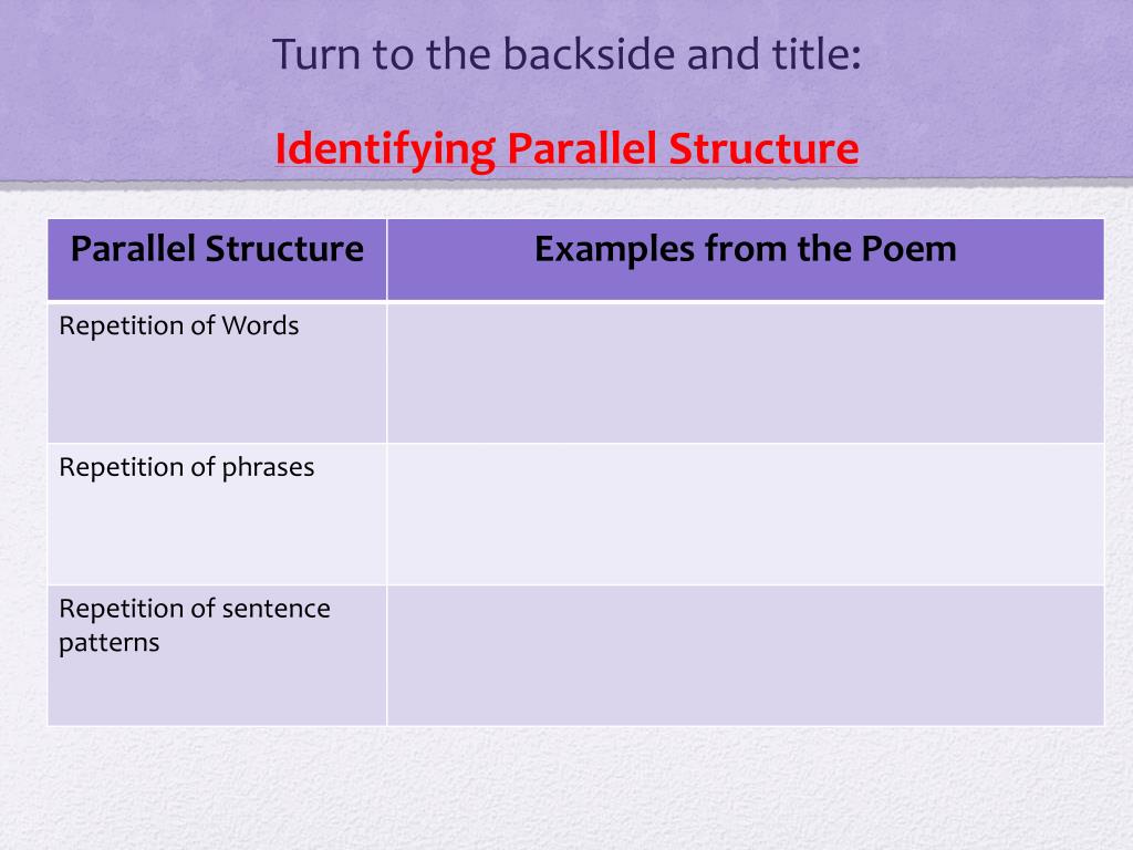 Literary Terms: “Poetry- Walt Whitman” • 5.parallel structure – the repetition of phrases, clauses, or sentences that have the same grammatical structure. • Example: • My Noisy BrotherHe slurps when he eats cereal in the morning.He gargles milk.He burps after eating.He cracks his knuckles.He whistles.He snaps his fingers.He squawks when he's mad.He snores at night.
