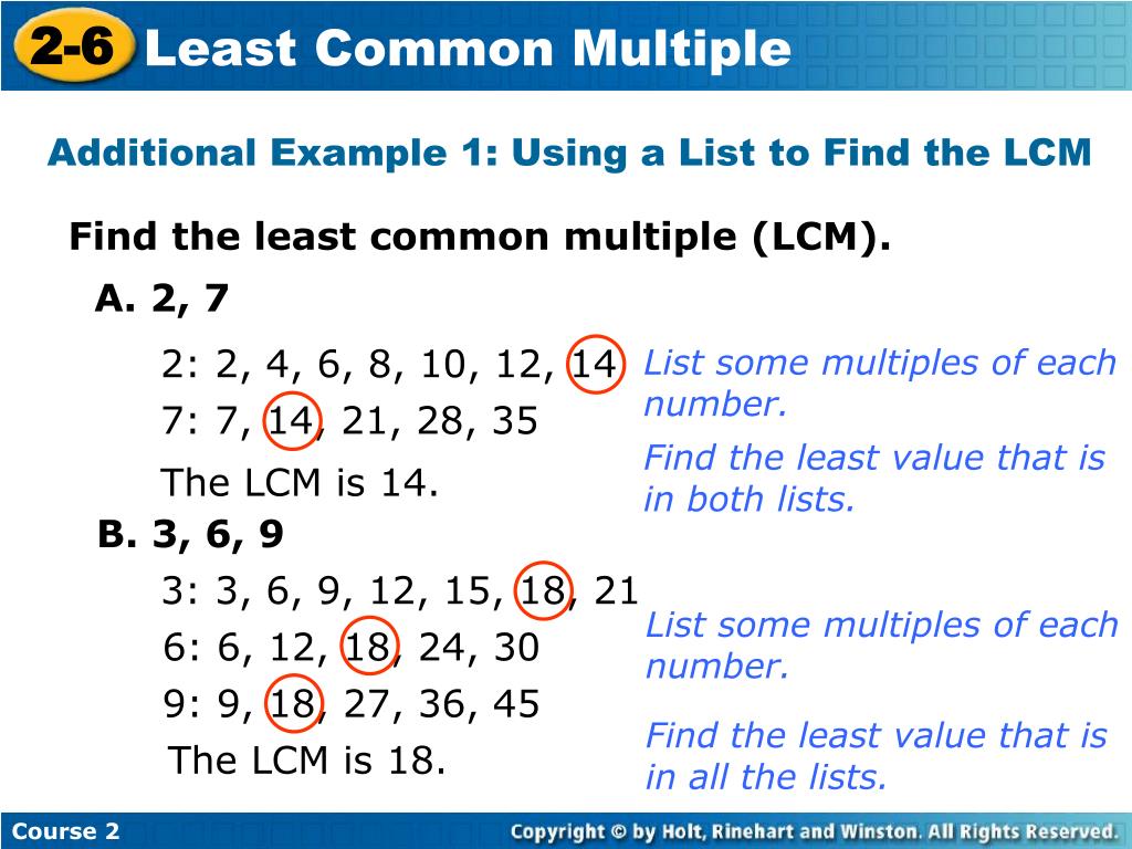 2-6 Least Common Multiple Course 2 Additional Example 1: Using a List to Find the LCM Find the least common multiple (LCM). A. 2, 7 2: 2, 4, 6, 8, 10, 12, 14 List some multiples of each number. 7: 7, 14, 21, 28, 35 Find the least value that is in both lists. The LCM is 14. B. 3, 6, 9 3: 3, 6, 9, 12, 15, 18, 21 List some multiples of each number. 6: 6, 12, 18, 24, 30 9: 9, 18, 27, 36, 45 Find the least value that is in all the lists. The LCM is 18.