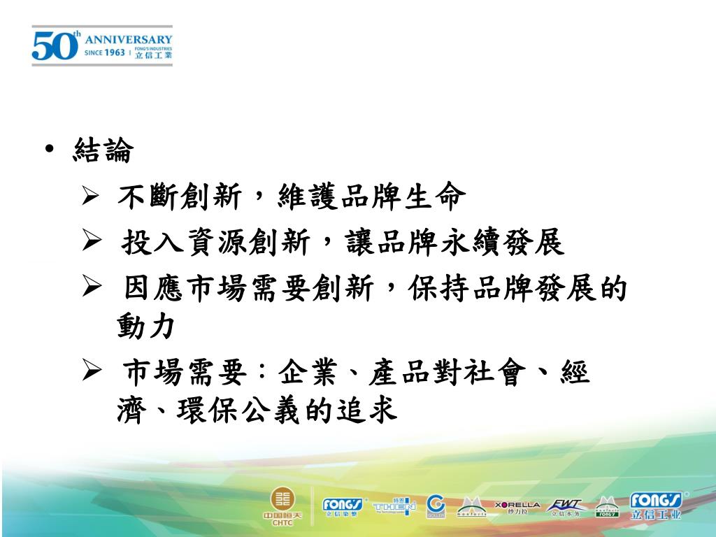 結論 不斷創新,維護品牌生命 投入資源創新,讓品牌永續發展 因應市場需要創新,保持品牌發展的 動力 市場需要:企業、產品對社會、經 濟、環保公義的追求