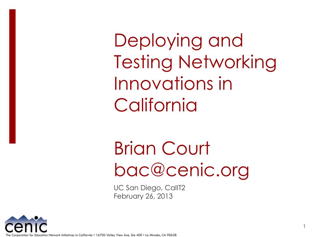 Deploying and Testing Networking Innovations in CaliforniaBrian Courtbac@cenic.org UC San Diego, CalIT2 February 26, 2013