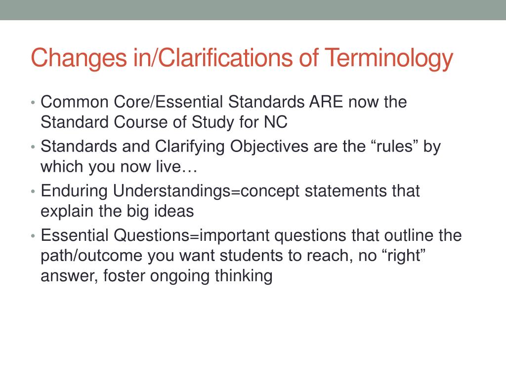 Changes in/Clarifications of Terminology • Common Core/Essential Standards ARE now the Standard Course of Study for NC • Standards and Clarifying Objectives are the “rules” by which you now live… • Enduring Understandings=concept statements that explain the big ideas • Essential Questions=important questions that outline the path/outcome you want students to reach, no “right” answer, foster ongoing thinking