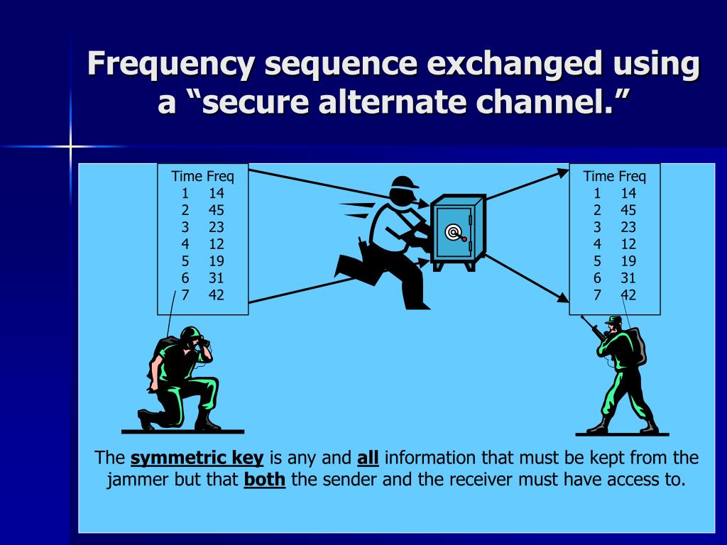 Frequency sequence exchanged using a “secure alternate channel.” • Time Freq • 14 • 45 • 23 • 12 • 19 • 31 • 42 • Time Freq • 14 • 45 • 23 • 12 • 19 • 31 • 42 The symmetric key is any and all information that must be kept from the jammer but that both the sender and the receiver must have access to.
