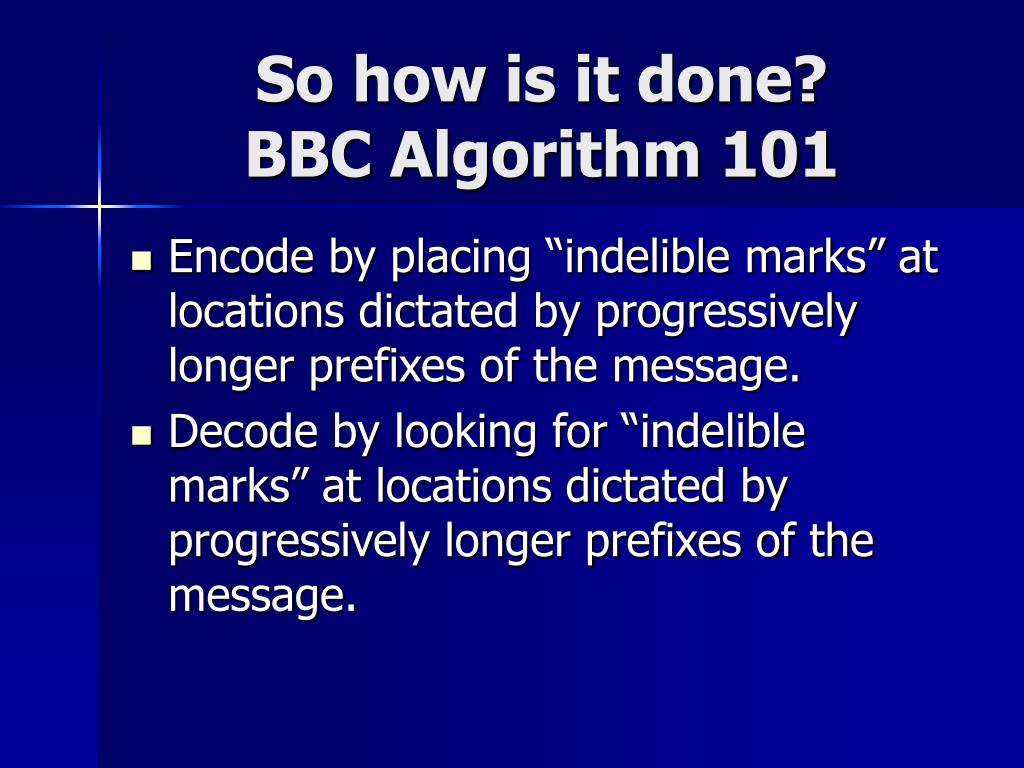 So how is it done?BBC Algorithm 101 • Encode by placing “indelible marks” at locations dictated by progressively longer prefixes of the message. • Decode by looking for “indelible marks” at locations dictated by progressively longer prefixes of the message.