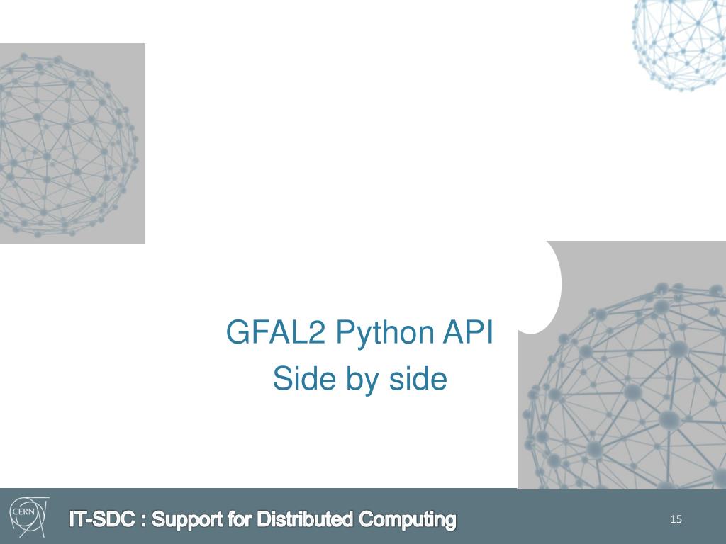 GFAL2: More Pythonic import gfal2 ctx = gfal2.creat_context() try: ctx.listdir(‘srm://…’) except gfal2.Gerror, e: print“[%d] %s” % (e.code, e.message)