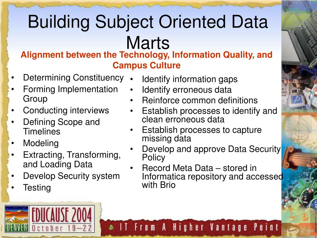 Determining Constituency Forming Implementation Group Conducting interviews Defining Scope and Timelines Modeling Extracting, Transforming, and Loading Data Develop Security system Testing Identify information gaps Identify erroneous data Reinforce common definitions Establish processes to identify and clean erroneous data Establish processes to capture missing data Develop and approve Data Security Policy Record Meta Data – stored in Informatica repository and accessed with Brio Building Subject Oriented Data Marts Alignment between the Technology, Information Quality, and Campus Culture