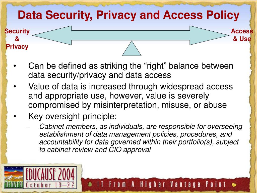 Data Security, Privacy and Access Policy Security & Privacy Access & Use • Can be defined as striking the “right” balance between data security/privacy and data access • Value of data is increased through widespread access and appropriate use, however, value is severely compromised by misinterpretation, misuse, or abuse • Key oversight principle: • Cabinet members, as individuals, are responsible for overseeing establishment of data management policies, procedures, and accountability for data governed within their portfolio(s), subject to cabinet review and CIO approval