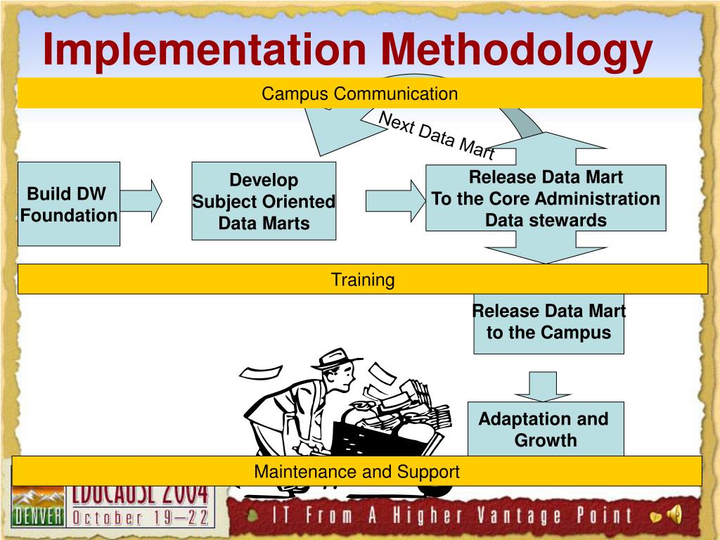 Implementation Methodology Campus Communication Next Data Mart Release Data Mart To the Core Administration Data stewards Build DW Foundation Develop Subject Oriented Data Marts Training Release Data Mart to the Campus Adaptation and Growth Maintenance and Support
