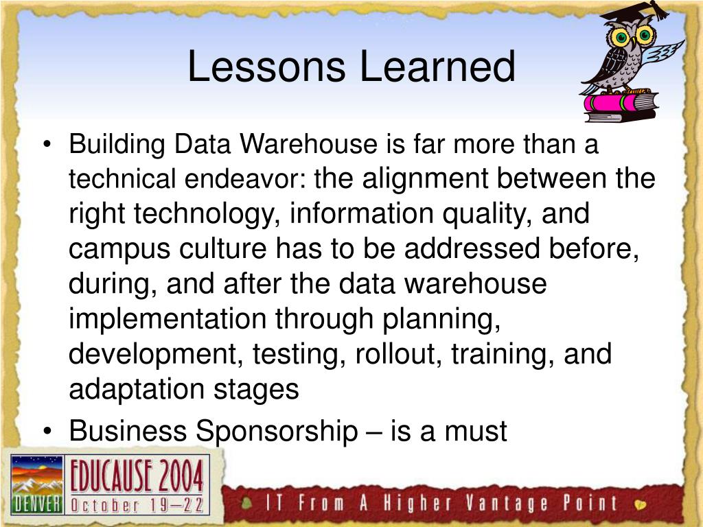 Lessons Learned • Building Data Warehouse is far more than a technical endeavor: the alignment between the right technology, information quality, and campus culture has to be addressed before, during, and after the data warehouse implementation through planning, development, testing, rollout, training, and adaptation stages • Business Sponsorship – is a must