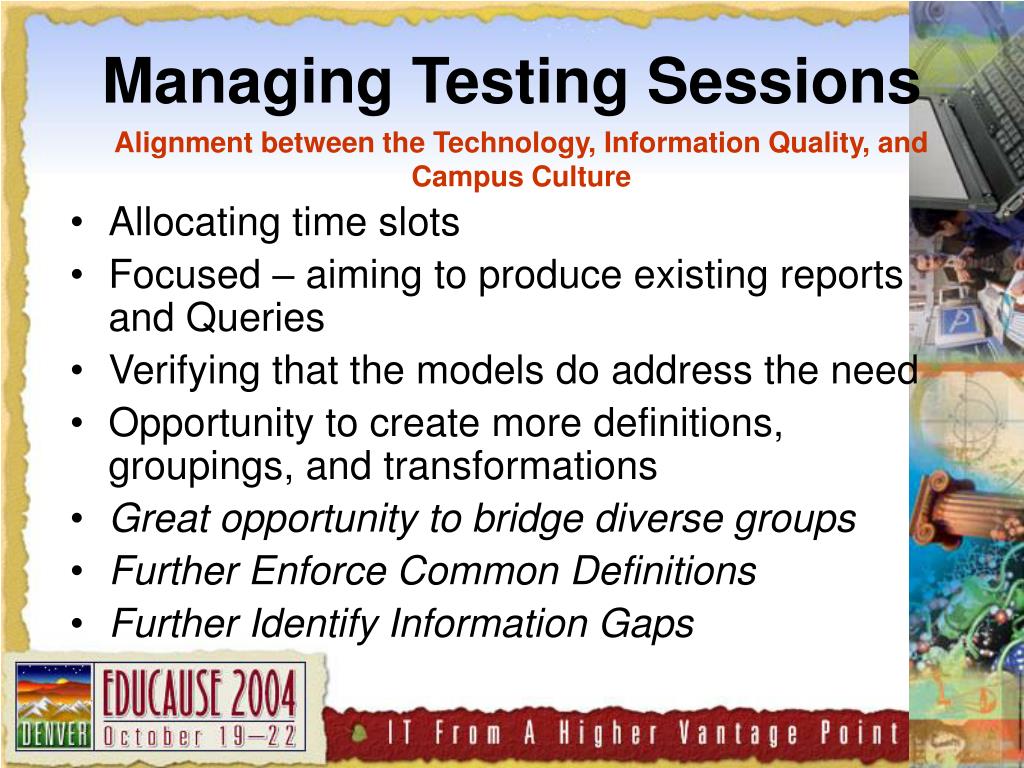 Managing Testing Sessions Alignment between the Technology, Information Quality, and Campus Culture • Allocating time slots • Focused – aiming to produce existing reports and Queries • Verifying that the models do address the need • Opportunity to create more definitions, groupings, and transformations • Great opportunity to bridge diverse groups • Further Enforce Common Definitions • Further Identify Information Gaps