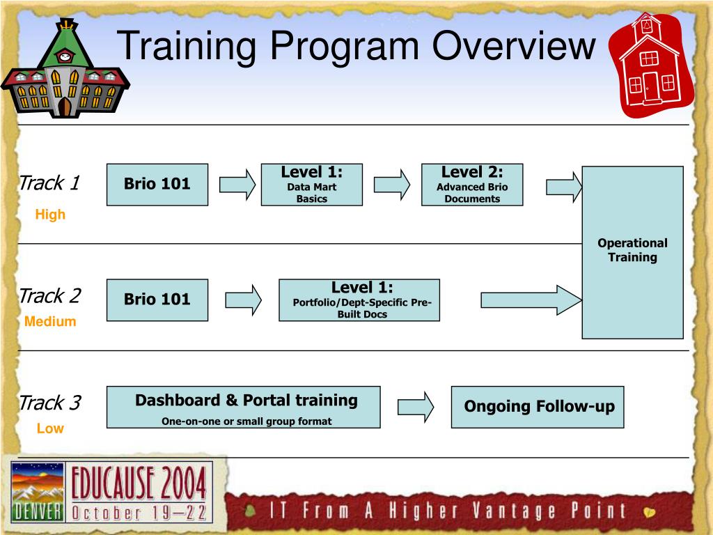 Level 1: Data Mart Basics Level 2: Advanced Brio Documents Brio 101 Operational Training Level 1: Portfolio/Dept-Specific Pre-Built Docs Brio 101 Dashboard & Portal training One-on-one or small group format Ongoing Follow-up Training Program Overview Track 1 High Track 2 Medium Track 3 Low