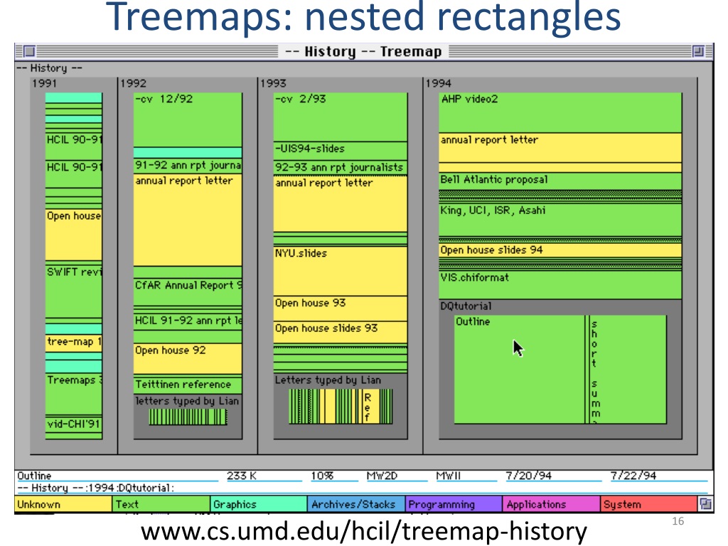 Treemaps: nested rectangles www.cs.umd.edu/hcil/treemap-history