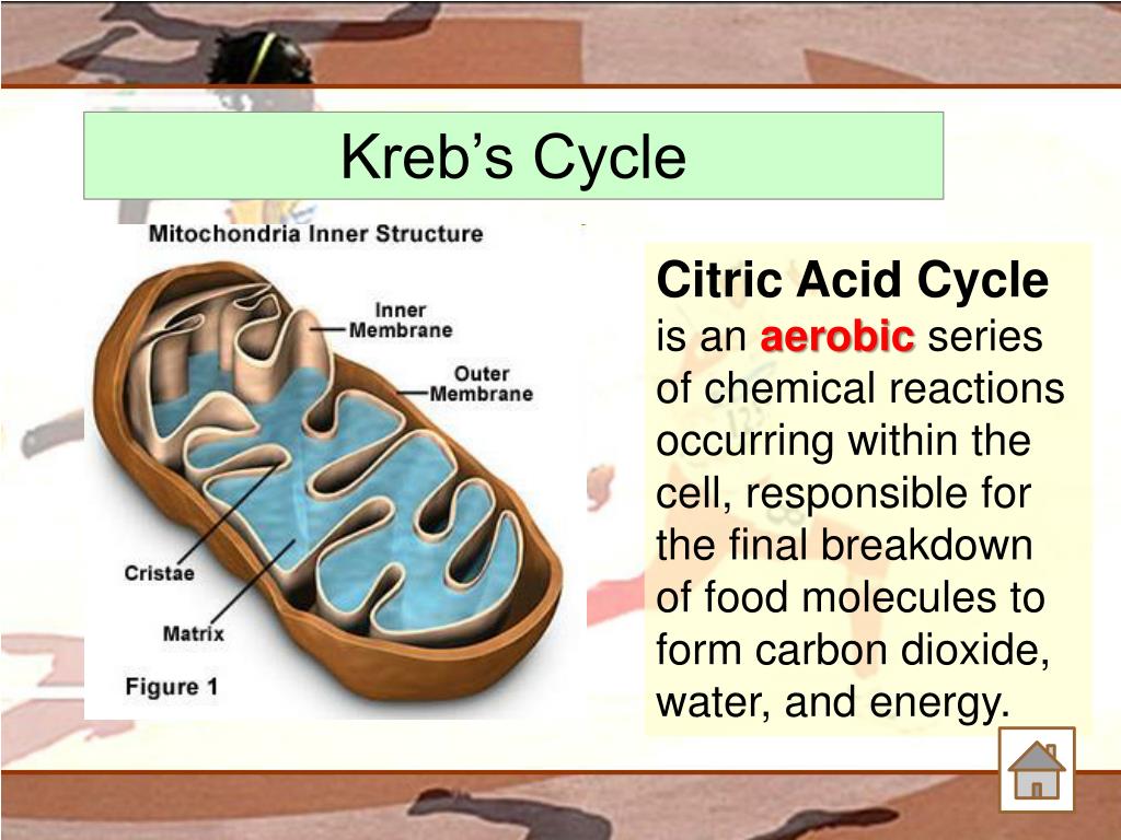 Kreb’s Cycle Cell Respiration Citric Acid Cycle is an aerobic series of chemical reactions occurring within the cell, responsible for the final breakdown of food molecules to form carbon dioxide, water, and energy.