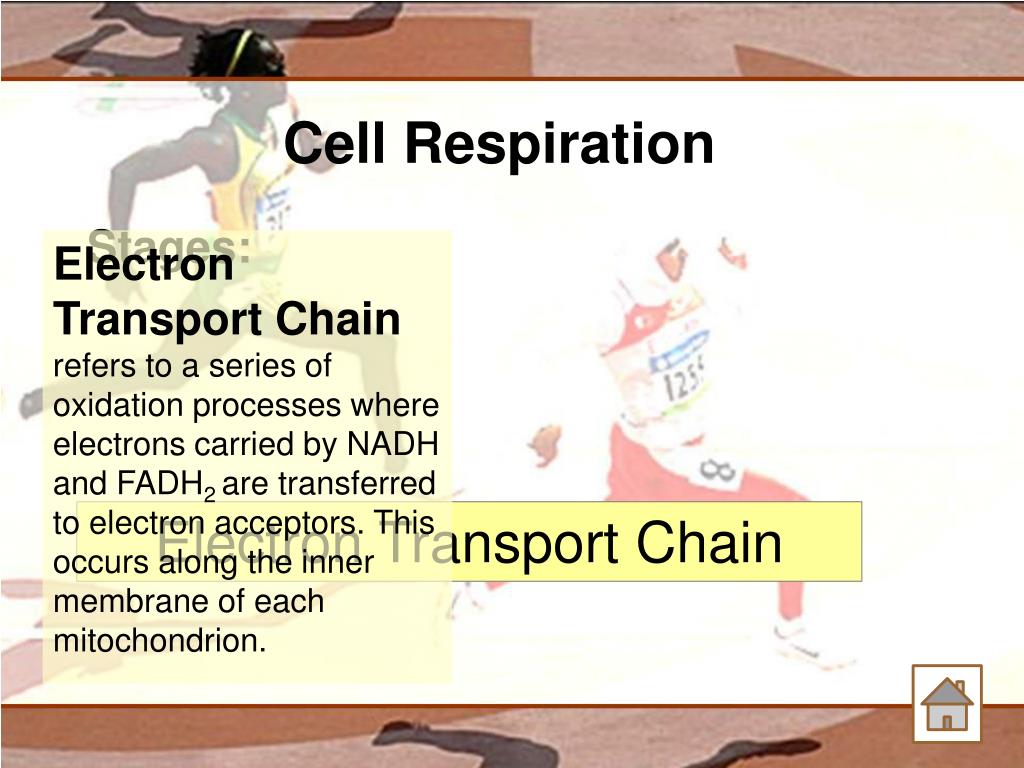 Cell Respiration Stages: Electron Transport Chain refers to a series of oxidation processes where electrons carried by NADH and FADH2 are transferred to electron acceptors. This occurs along the inner membrane of each mitochondrion. Electron Transport Chain