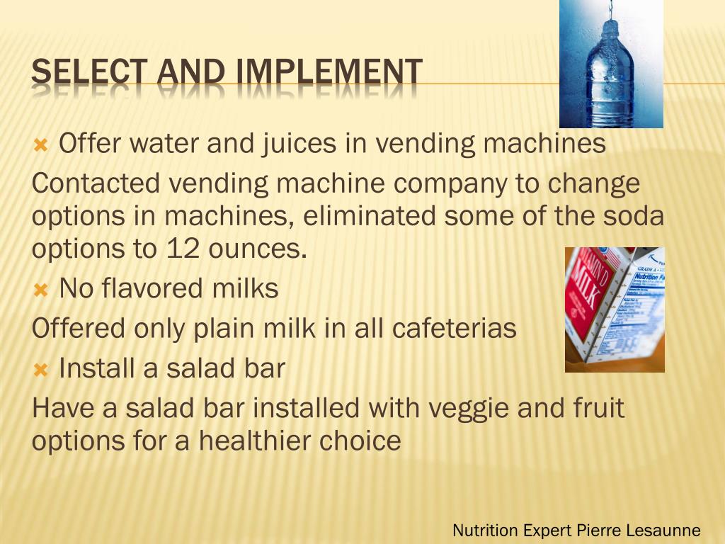 Offer water and juices in vending machines Contacted vending machine company to change options in machines, eliminated some of the soda options to 12 ounces. No flavored milks Offered only plain milk in all cafeterias Install a salad bar Have a salad bar installed with veggie and fruit options for a healthier choice Select and Implement Nutrition Expert Pierre Lesaunne