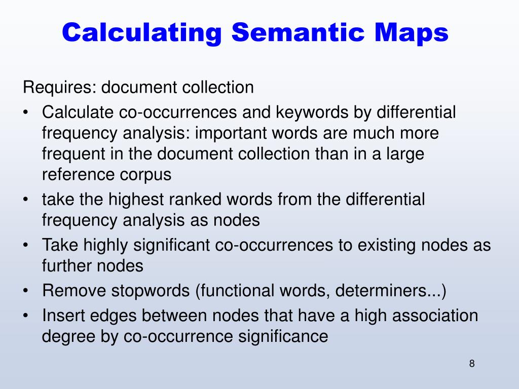 Calculating Semantic Maps Requires: document collection • Calculate co-occurrences and keywords by differential frequency analysis: important words are much more frequent in the document collection than in a large reference corpus • take the highest ranked words from the differential frequency analysis as nodes • Take highly significant co-occurrences to existing nodes as further nodes • Remove stopwords (functional words, determiners...) • Insert edges between nodes that have a high association degree by co-occurrence significance