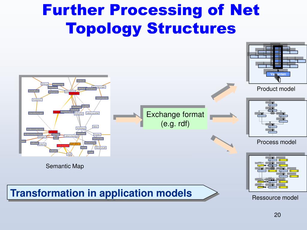 Further Processing of Net Topology Structures Product model Exchange format (e.g. rdf) Varianten Process model Semantic Map Ressource model Transformation in application models