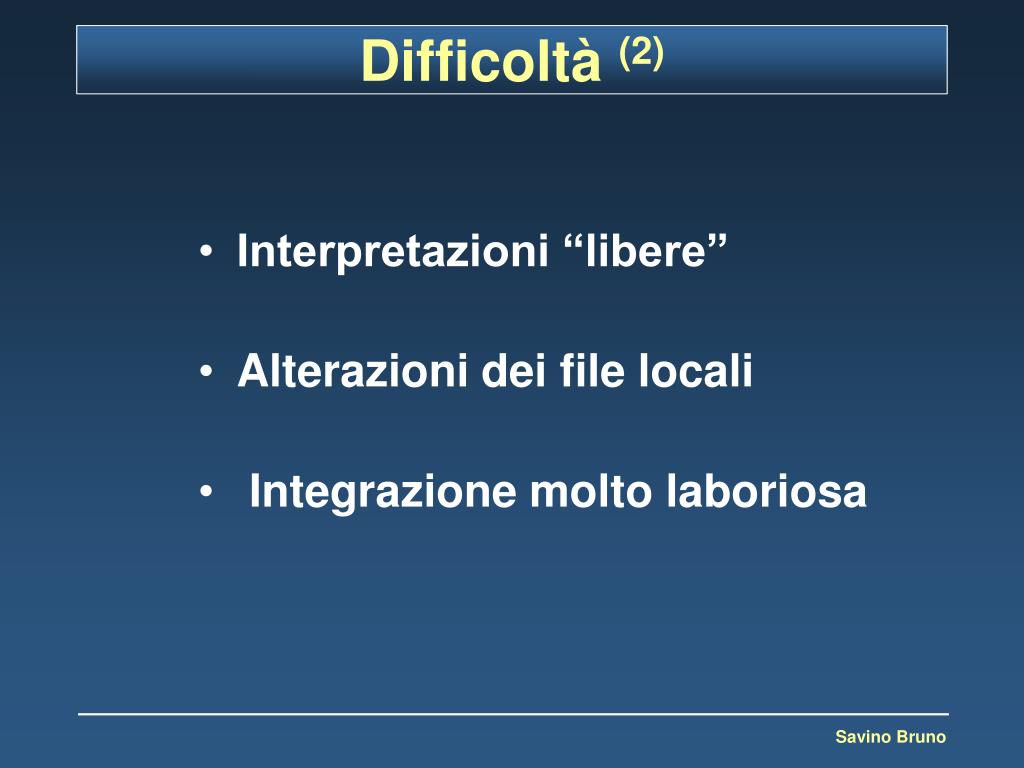 Difficoltà (2) • Interpretazioni “libere” • Alterazioni dei file locali • Integrazione molto laboriosa Savino Bruno