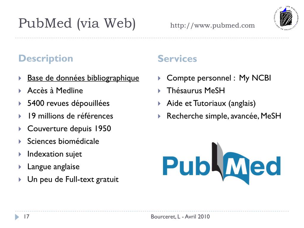 PubMed (via Web) http://www.pubmed.com Description Services • Base de données bibliographique • Accès à Medline • 5400 revues dépouillées • 19 millions de références • Couverture depuis 1950 • Sciences biomédicale • Indexation sujet • Langue anglaise • Un peu de Full-text gratuit • Compte personnel : My NCBI • Thésaurus MeSH • Aide et Tutoriaux (anglais) • Recherche simple, avancée, MeSH Bourceret, L - Avril 2010