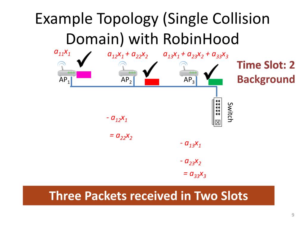 Example Topology (Single Collision Domain) with RobinHood a11x1 a12x1 + a22x2 a13x1 + a23x2 + a33x3 Time Slot: 2 Time Slot: Background AP1 AP2 AP3 Switch - a12x1 = a22x2 - a13x1 - a23x2 = a33x3 • Three Packets received in Two Slots