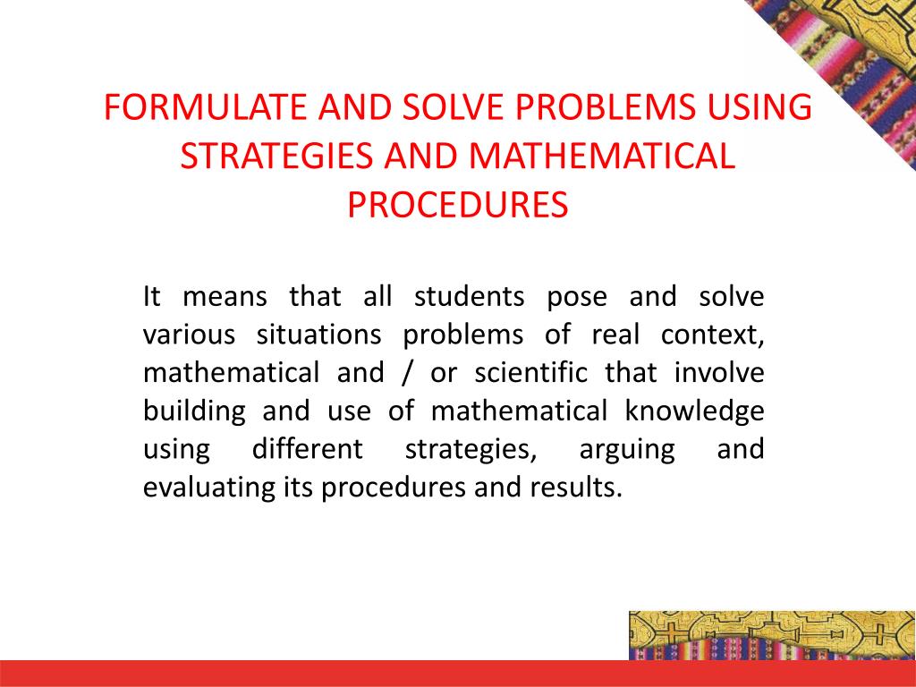 FORMULATE AND SOLVE PROBLEMS USING STRATEGIES AND MATHEMATICAL PROCEDURES It means that all students pose and solve various situations problems of real context, mathematical and / or scientific that involve building and use of mathematical knowledge using different strategies, arguing and evaluating its procedures and results.
