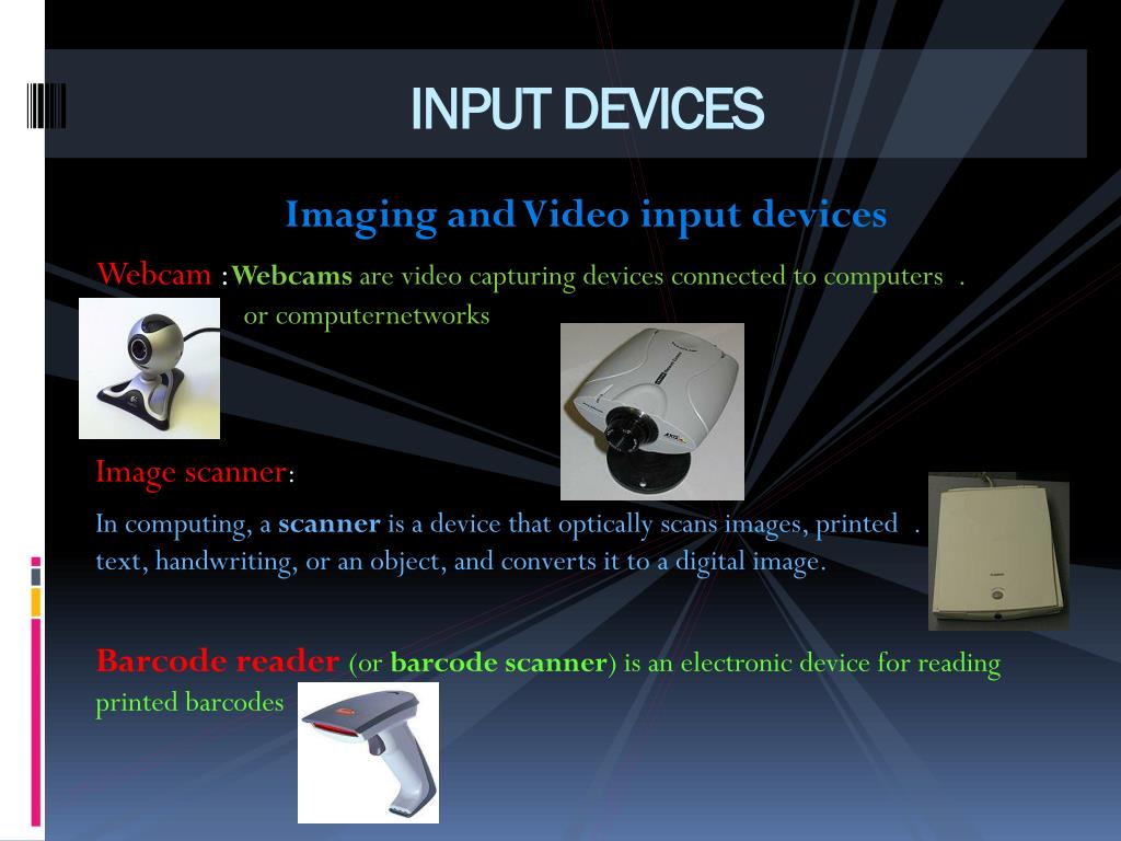 INPUT DEVICES Imaging and Video input devices Webcam:Webcams are video capturing devices connected to computers . . orcomputernetworks Imagescanner: In computing, a scanner is a device that optically scans images, printed . text, handwriting, or an object, and converts it to a digital image. Barcode reader(or barcode scanner) is an electronic device for reading printed barcodes