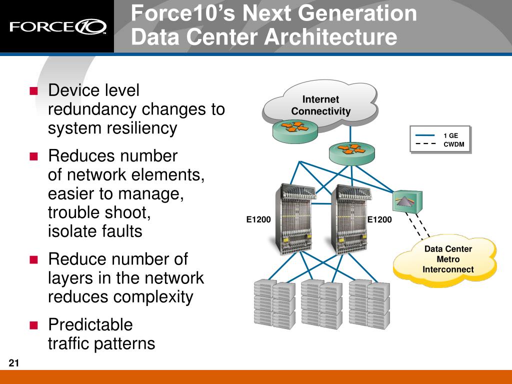 Internet Connectivity 1 GE CWDM Force10’s Next Generation Data Center Architecture • Device level redundancy changes to system resiliency • Reduces number of network elements, easier to manage, trouble shoot, isolate faults • Reduce number of layers in the network reduces complexity • Predictable traffic patterns E1200 E1200 Data Center Metro Interconnect